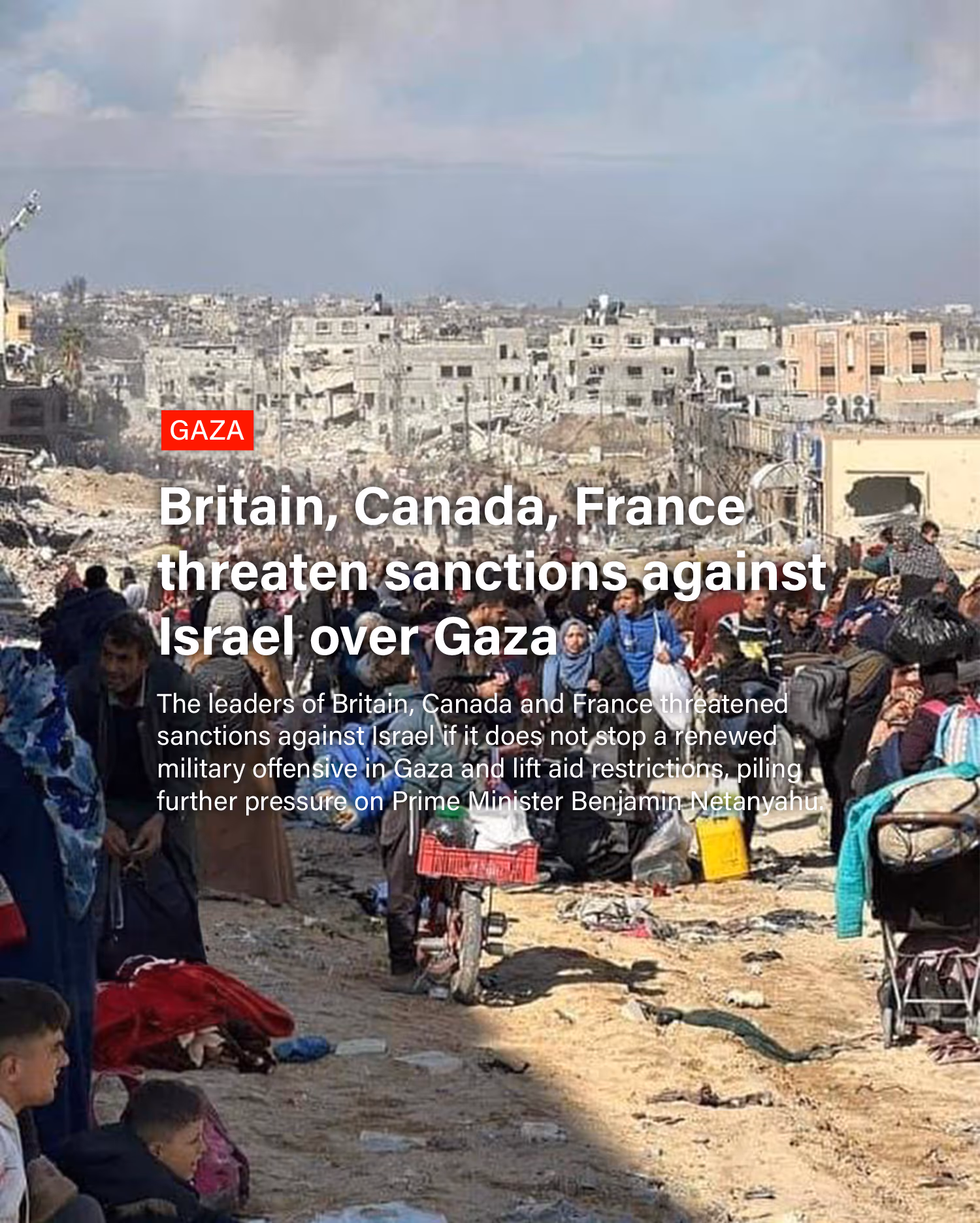ביום שלישי (20.5) פורסם שצרפת, קנדה ובריטניה יצאו בהצהרה משותפת ובה הכריזו כי ינקטו צעדים קונקרטיים נגד ישראל אם לא תופסק המתקפה על רצועת עזה ויוסרו ההגבלות על הכנסת סיוע אליה. "אנחנו לא נעמוד מנגד כאשר ממשלת נתניהו מקדמת את הצעדים המחפירים הללו", נאמר בהודעתן.