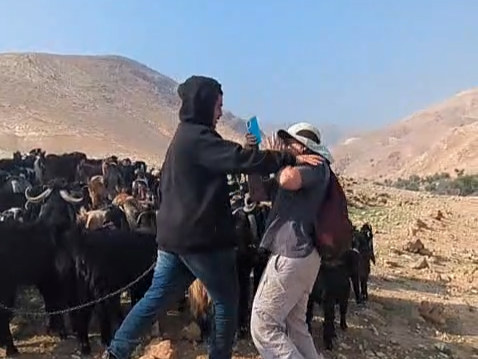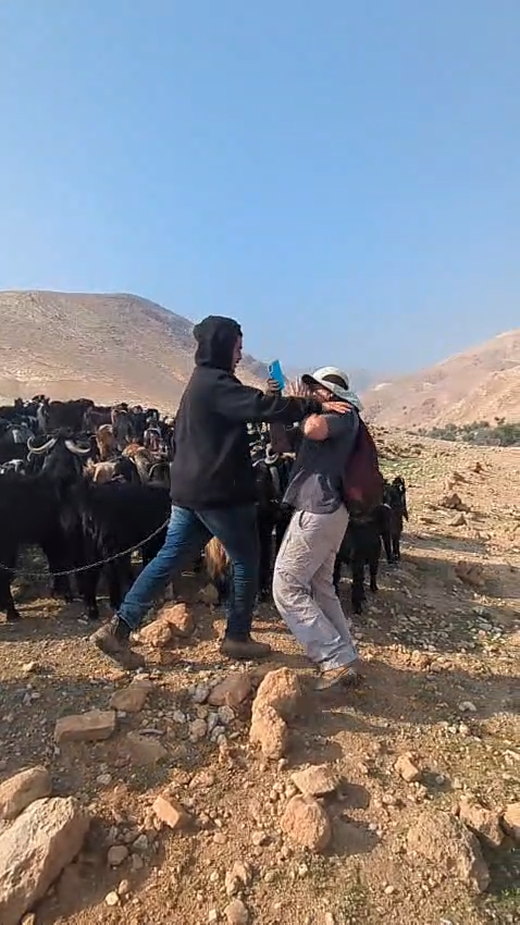 יום שני - מתנחל קרב עם העיזים קרוב למתחם משפחת אבו-טאלב. לפתע הגיח לעבר הפעילים הצמיד טלפון לפרצופה של מתנדבת וחזר לעדרו.